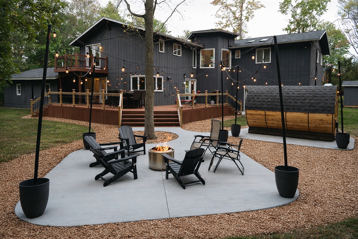 The fire pit area offers the biggest Solo Stove we could get. Once you get the fire going, it is smokeless and is a real treat to hang out at- no dodging the smoke! With adjustable adirondack chairs and string lights around the fire pit area, it's a great spot to relax between sauna sessions and hangout at the end of the day.