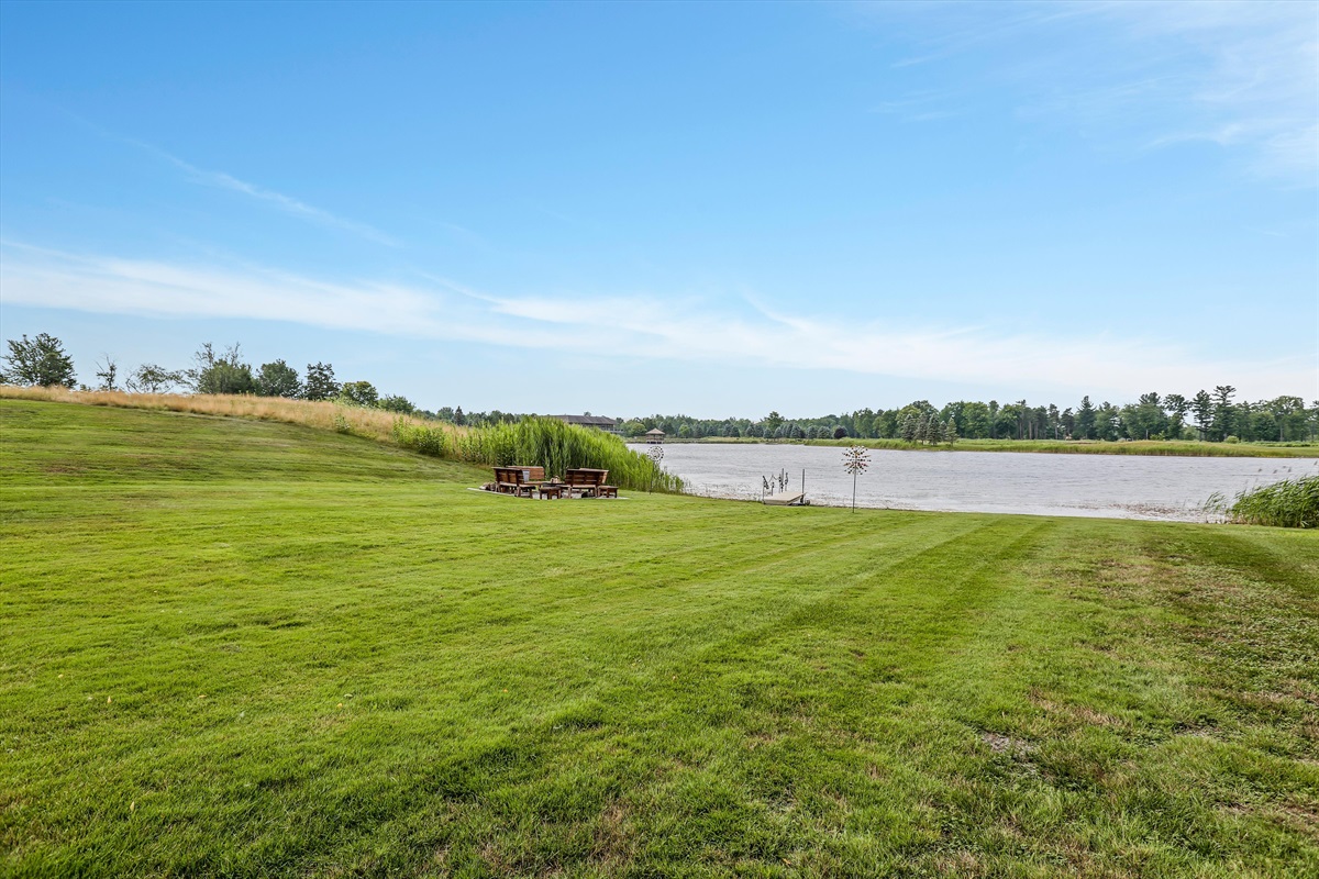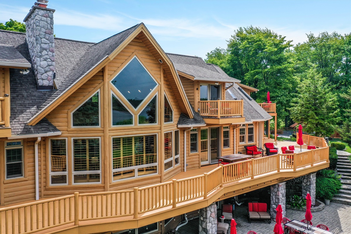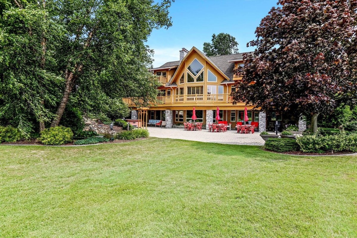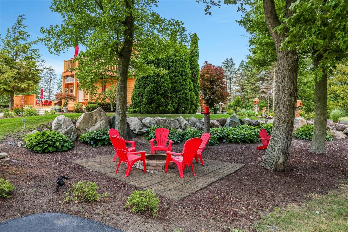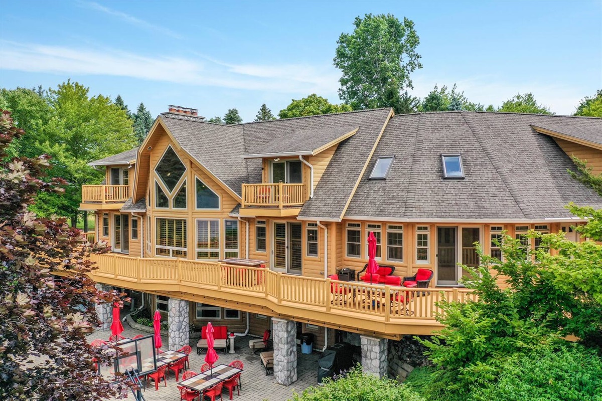 The wrap around main deck provides a large gas grill, bar height fire table, , numerous seating areas, patio tables, chairs and umbrellas. The brick paver patio provide guests with a 4 person hot tub and an outdoor basketball hoop. A stainless steel fire pit for a wood burning camp fire as well as a custom made benches and tables is located at the water front. Camp fire wood is provided for each night stay.