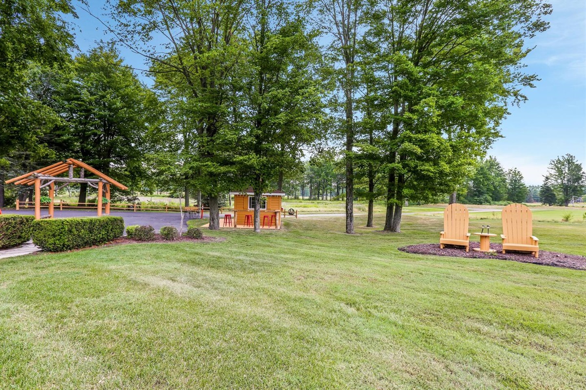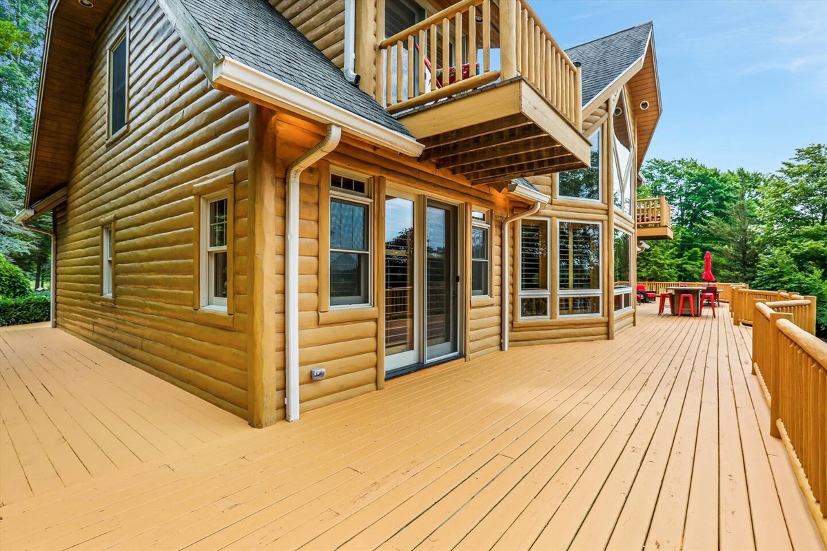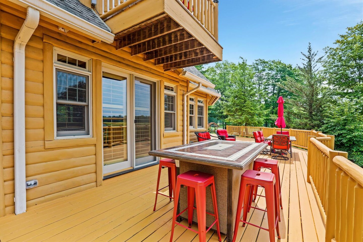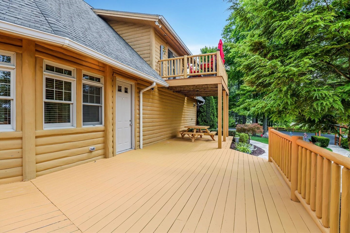 The wrap around main deck provides a large gas grill, bar height fire table, , numerous seating areas, patio tables, chairs and umbrellas. The brick paver patio provide guests with a 4 person hot tub and an outdoor basketball hoop. A stainless steel fire pit for a wood burning camp fire as well as a custom made benches and tables is located at the water front. Camp fire wood is provided for each night stay.
