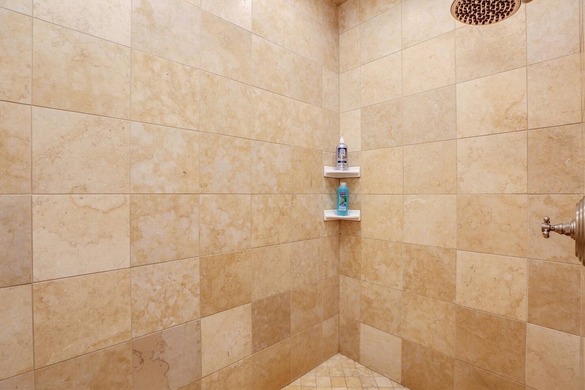 A two person Jacuzzi tub is located in the master suite in addition to the massive marble or Italian tumbled tile walk in showers in 3 of the 4 bathrooms.